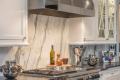 The kitchen is anchored by a large, 12-foot-long island painted in black. “It’s enormous,” Joy says of the island. “It seats four. There is no kitchen table in the room.” Black leather barstools with nailhead trim pull up to the island for casual seating. Selecting a quality barstool is very important, according to Joy. “To me, a barstool is like a good pair of shoes,” she says. “They have to be comfortable, they get a lot of wear and tear, and a lot of people want an inexpensive barstool, like they do shoes.” Investing in quality merchandise that’s heavily used pays off in the long run, she says. Opposite the island, French doors lead to a large patio featuring an outdoor kitchen, fireplace and a TV for all-seasons entertaining.
