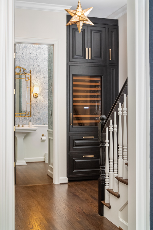 The homeowner’s love of blue and white is fully displayed in the powder room. The designers turned the room into a showstopper by selecting Clarence House “Tibetan Dragon” wallpaper to top new white wainscoting. A new pedestal sink features rubbed brass fixtures from Immerse. Fratt found a bamboo mirror at a consignment shop. Painting the powder room door black allows new crystal and brass doorknobs to pop. Fratt added the Monrovian star light in the hallway outside the powder room. “Teeny tweaks like these just change everything,” Fratt says of custom touches.