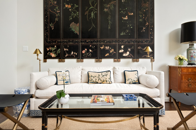 Some of the homeowner’s Asian art was inherited from her mother and grandparents, while other pieces were purchased on business trips. Above a Highland House custom sofa in creamy white, the designers hung a Chinese folding screen from the homeowner’s collection. “Hanging it gives the piece great presence rather than using it as a room divider,” Fratt explains. “It is a beautiful piece of art, but we used it AS a piece of art.”