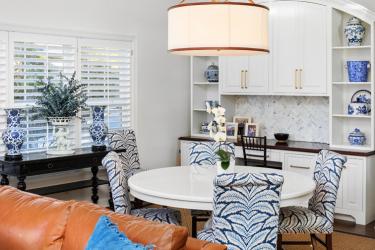 In its original iteration, the designers felt the hearth room “had a lot of darkness,” Fratt says. To lighten the room, an existing round cherry table was painted a high-gloss white. Terracotta chairs were recovered in a blue and white Talavera fabric from Brunschwig & Fils. A Ralph Lauren light is trimmed in leather to coordinate with a new leather sectional. An archway on the built-in bookcase mimics the shape of the new kitchen window. The fireplace, originally a red brick, was clad in limestone to meld with the limestone used in the piazza just steps away. Such customization “adds interest and gives it personal detail,” Fratt says. “Everything about the room feels different.”