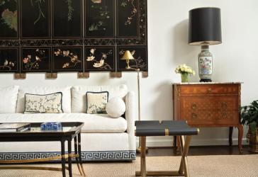 On the opposite wall, the designers placed a beloved painting the homeowner affectionally calls “The Ancestors” above a smaller sofa. “It’s a Chinese dynasty, a beautiful piece which is quite large—probably six feet wide and eight or nine feet tall,” says Fratt. “The homeowner has a very sophisticated sense of style.”