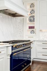 Design work began in the kitchen. The homeowner fell in love with a Lacanche range in French blue. “It’s a major cooking stove,” Fratt says of the centuries-old French brand. The wife is already a good cook, Fratt says, but the homeowner wanted to improve her skills even more. At the same time, the homeowner had always wanted an all-white kitchen to highlight her blue and white china. Collaborating with Mike Beck of Beck/Allen Cabinetry, the homeowners reconfigured the kitchen, eliminating all existing cabinetry and the original island. The designers removed a mullion window and fitted a larger picture window shaped to mimic a design element in the piazza. They installed a large, marble-topped island, running it parallel to the stove. Upon entering the room, the eye is drawn immediately along the island to the window, which frames the view of the piazza. A second, "entertaining" island at pub-table height was added; it acts as a buffer between the kitchen and the adjoining hearth room.