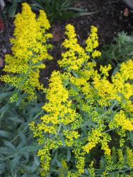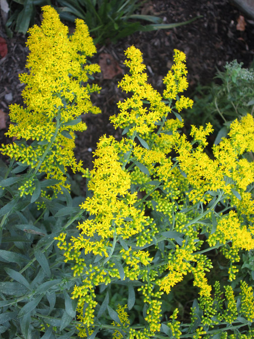 Showy Goldenrod blooms from September to October with clusters of bright yellow flowers. It does reseed some, but it's not overly aggressive. It has slender stalks 4-5 feet tall, and it's deer resistant. Plant in full sun in dry to average soil. Sue Leahy, Greenscape Gardens.