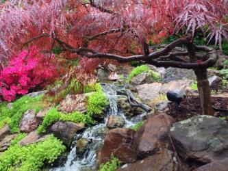 Bauer Falls uses deep red Laceleaf Japanese maples in their luxury waterfalls and koi ponds because their elegant, circular look lives in harmony with the natural stone boulders. Caleb and Josh Bauer hand select them. Japanese maples also provide water gardens in particular loads of interest with a showy fall color that reflects and radiates throughout the entire year. Caleb Bauer, Bauer Falls.
