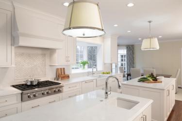 A few special features dress up the space. Mullion cabinets filled with sparkling glassware flank the entrance to the dining room, creating a butler’s pantry, and the quartz backsplash over the range top includes a decorative marble tile inlay. Polished nickel finishes throughout the room add sparkle. The wallcovering and fabric window treatments, both selected by interior designer Corinne Jones, provide texture and a hint of warmth to balance the starkness of the hard, white surfaces. For Mary Ann, the beauty of the kitchen is only emphasized by its function, and that makes Christine smile. Her favorite feature of the room is that it achieves what the clients asked for.