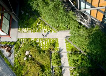 NEO Bankside, London,United Kingdom. | Architect: Gillespies | Photography courtesy of Gillespies/Jason Gairn: The main focus of the outdoor area at the NEO Bankside Development, an upscale apartment building in the heart of London, was to wed both the private aspects of a personal garden with the energy of a public park in town. These spaces allow residents to engage with nature while creating a micro-ecological environment inside a bustling urban setting. To separate the space from the city clamor, the gardens are lined with trees to create tranquil green spaces filled with seasonal fruit trees, bee hives and an herb garden. Linear groves of aspen and birch trees create a public area between the apartment complex and the neighboring building, Tate Modern. The landscape architects wanted this space to be beautiful and functional while making as minimal of an environmental impact as possible. To achieve this, they planted a wide variety of native plants, which would not only grow robustly and tolerate local weather conditions and the stresses of a public environment, but would serve to educate residents about their native flora as well. With sustainability and biodiversity in mind, the gardens of NEO Bankside provide an oasis amidst a busy city scape.