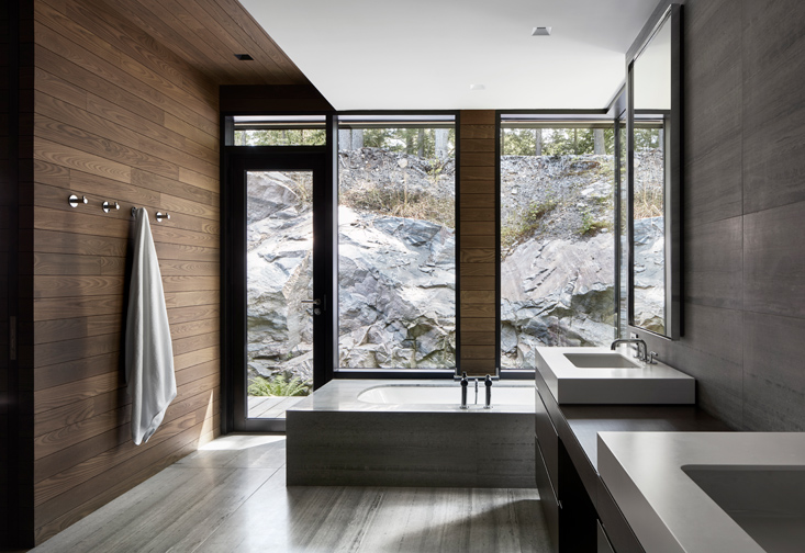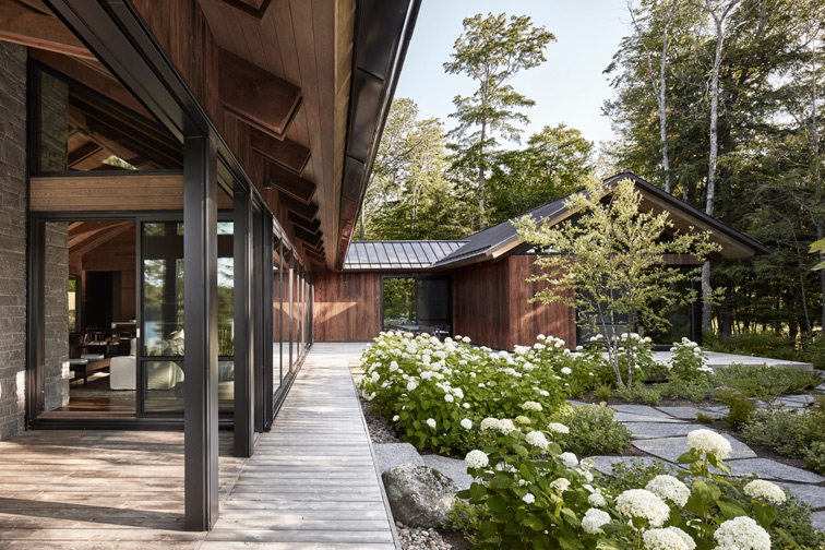Metrick Cottage and Boathouse, Ontario, Canada: Photography by Shai Gil, courtesy of AKB Architects | Designed to blend elegantly with the surrounding rugged Ontario landscape, the Metrick cottage and boathouse is the perfect seasonal home getaway for the owners on the banks of Lake Joseph. It sits among other seasonal homes on the waterfront as a one-story wood-clad residence built to house multiple generations in an eco-friendly manner. The boathouse, situated at water level with three available slips, is part of the 5,400 square-foot property with an unobstructed view of the lake and its shoreline. The designers at AKB Architecture knew that the home was to be mainly comprised of all-natural wood materials, such as Douglas fir timbers and cedar decks, most of which had to be transported by boat due to the challenging topography. In addition to fitting the desired aesthetic, the natural wood materials were also durable enough to withstand the harsh Ontario climates. To further its durability, designers employed the surface charring method of shou sugi ban; charring of this type reduces the wood’s susceptibility to fire, pests and rot. Finally, shou sugi ban makes the cottage seem as if it was made to be there! Created as the perfect boreal forest retreat, the Metrick cottage and boathouse is an astounding example of the waterfront lifestyle.