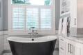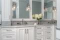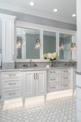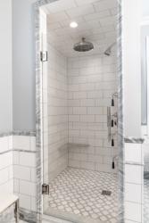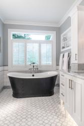 A disastrous plumbing installation prompted a full master bathroom remodel. Alspaugh Kitchen & Bath led the renovation making the tub the star of the show. The homeowners fell in love with a matte black freestanding tub bedecked with strapping and rivets. Industrial-style fittings with matte black accents were selected for the faucets and tub filler to complement the cast-iron tub. The polished nickel finish on the fitting and sconces provide a punch of glam. The long vanity features double sinks with concealed medicine cabinets mounted flush inside framed mirrors. Two wall cabinet towers bookend the mirror frames to provide the owners with plenty of storage. Under-cabinet lighting beneath the vanity accentuates the extra tall toe space and tulip feet. The mosaic pattern of the tile floor resembles chain link, while the gray-and-white marble material amps up the luxury factor. White marble lines the walls in wainscot fashion contrasting with gray marble baseboard, chair rail and accent pencil trim. The marble wall continues into the shower, which is enclosed by a frameless low-iron glass door that has been coated to reduce water spotting. Industrial style and refined materials mix in this unique bath that is full of charm, luxury and comfort.