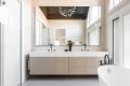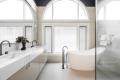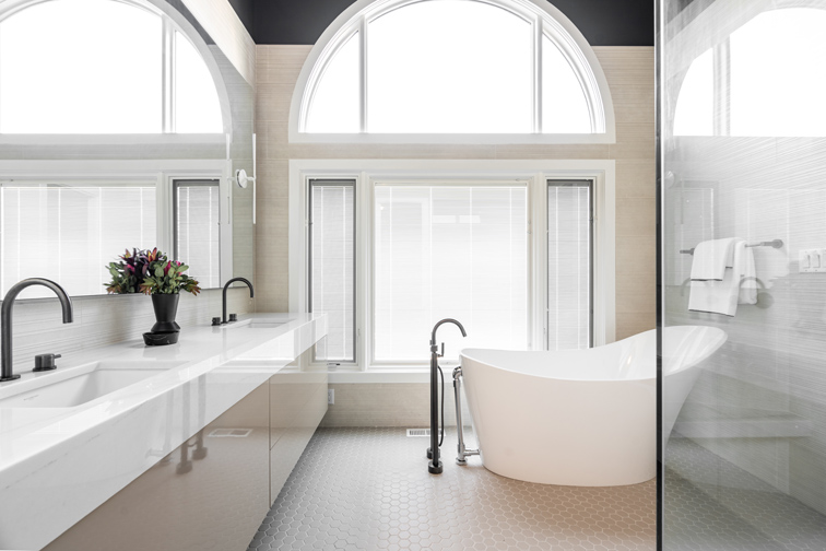 A constantly traveling professional wanted to transform his Clayton residence into a restful home. He worked with C&M Interiors and Chouteau Building Group to create an updated master bathroom to call his own. The main bathroom was originally laid out in an nonfunctional way with dated ‘90s décor. The designers were challenged by an unusually high ceiling and a wall of windows facing a busy street. By adding a charming barrel vault painted in Sherwin-Williams Black Fox, the space was transformed into a large, gallery style room with a stunning artistic chandelier to top it off. A custom high-lacquered vanity was specifically designed for the client and allows for light to bounce around the room. Neutral and textural tiles were selected to keep a masculine and tactile feel for this bachelor’s en suite. The main bathroom is now a comfortable inviting space that is both functional and high-end in appearance.