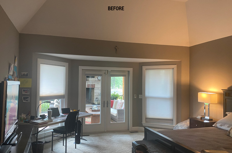 Finishing off the space are new furniture pieces and accents like the olive green velvet chair, lucite accent table and rich burlwood bedside tables with lucite hardware, which add warmth to the room. “I love the sitting area because it gives me an alternate space and makes a beautiful backdrop for business calls,” Shannon explains. “Someone actually asked me if my room was a virtual background!”