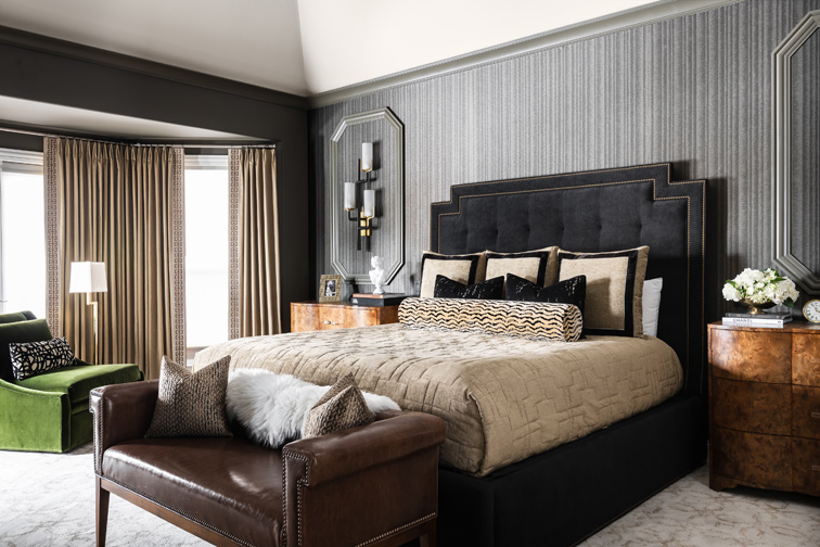 Lighting the bedroom was critical to the design. “The homeowner wanted a luxurious and cozy feeling, which I think we nailed with the right lighting,” they say. Behind the crown molding there is cove lighting, and everything in the space operates on a dimmer to adjust as the day goes on. “I can dim any aspect of the room from a small remote on my desk or an app on my phone,” the homeowner explains. The designers chose stunning sconces instead of bedside lamps for each side of the bed that fit perfectly into the high-end style. Tina and Lauren framed the sconces for an extra special touch.