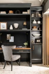 A large desk with lots of storage, built-in cabinetry and a comfortable desk chair were high on the priority list. The homeowner also requested adjustable lighting that could be changed depending on the occasion as well as a sitting area. The only specification she gave the Wolff team was that she wanted something dark, dramatic and sexy, yet still polished and pulled together.