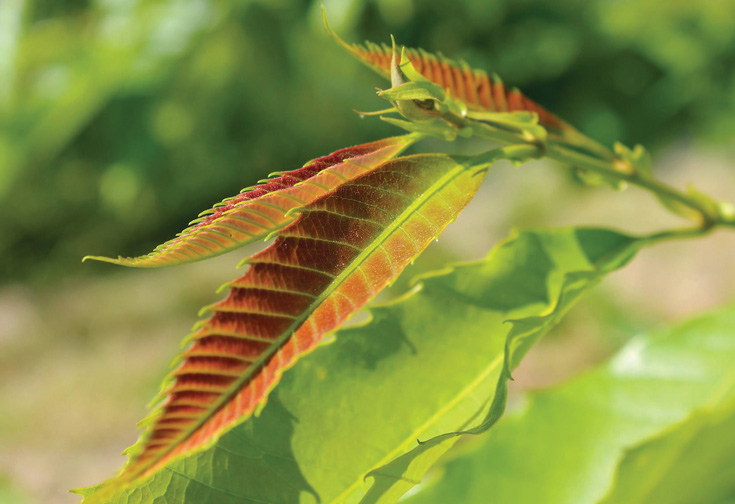 The American chestnut was once a major component of the forest ecosystem of eastern North America. It is now almost extinct in the wild, devastated by chestnut blight, a fungal disease introduced from East Asia. Chestnut trees were highly valued for their strong and rot-resistant timber and their edible nuts. The American Chestnut Foundation is working to breed a blight resistant American chestnut and reintroduce this tree to its original habitat. They are using a technique called backcrossing, which involves cross-breeding the American chestnut with the blight-resistant Chinese chestnut. One group of highly backcrossed blight-resistant chestnuts is called hybrid 15/16 B3F3, which is 15/16 (94%) Castanea dentata and 1/16 (6%) Castanea mollissima. This hybrid is currently in the testing phase, and TCF donated a few of these nuts to Missouri Botanical Garden for testing and for educating the public about the American chestnut. They are currently growing in the Garden's Oertli Family Hardy Plant Nursery and will be planted in the new visitor center landscape.
