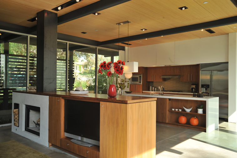 Free Flow, By O + L building projects, LLC. The design of the kitchen and idea of the multi-island elements dividing the space came as a result of the two flanking glass walls that create the single-story pavilion-type structure that the public sees of this house. The house was designed for a growing family with three boys so the design had to be casual and durable yet in keeping with the architecture. To that end a series of low-island type elements were used to separate the three uses of the space (living, dining and kitchen) while allowing for a free flow of space and visual access throughout. Photography by Anna Dilthy.