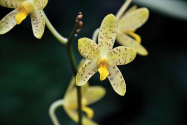 Ansellia africana is also known as the leopard orchid due to its beautiful spotted yellow flowers. It is also known as the "trash bucket" orchid because it will produce numerous non-absorbing airborne roots to collect leaf litter when nitrogen levels are not sufficient. This leaf litter will then break down and provide the plant with nutrients. Ansellia africana is a very large species that can reach weights of over a metric ton with pseudobulbs reaching 60 centimeters long. Flowers have a fragrance similar to cut Christmas greens. This orchid is endangered in the wild. The Garden’s conservation goals lead us to target rare or endangered species like this one for our collection, where we can study and preserve them for the future.