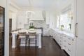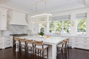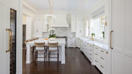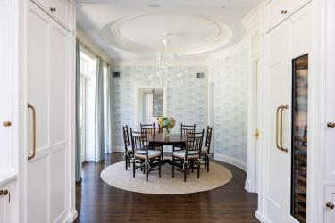 The homeowners worked closely with Gegg Design & Cabinetry on a complete transformation of their kitchen, dining and living room to respect the classic details of the 1936 home. The layout of the first floor was completely reimagined. The kitchen was relocated to make it more interactive for today’s living and the daily dining room was moved to the old kitchen space while still open to the kitchen. The designer took great care to respect the trim details of the historic home. White-painted beaded inset cabinetry includes solid brass hardware with a natural wax finish that will age and patina with use. The kitchen sink faces the private rear yard and pool area. The massive window gives a great view while providing plenty of natural light. The window details were considered with the cabinet design in that the upper and lower wall cabinet doors feature a bead molding that carries around the entire room and lands directly between the window and transom. Large sconces accent the wainscot-paneled window separations. One major issue was a structural beam between the new kitchen and dining room. Duct work that dropped below the ceiling could not be moved, so the solution was a design feature where the refrigerator, wine fridge and freezer units face inward toward one another in the space between the kitchen and dining area. A breakfast center cabinet features retractable doors to store small appliances.