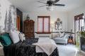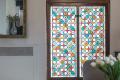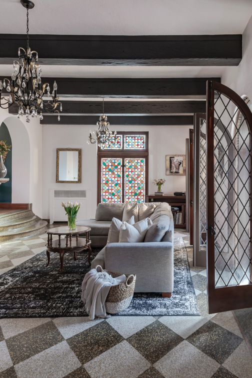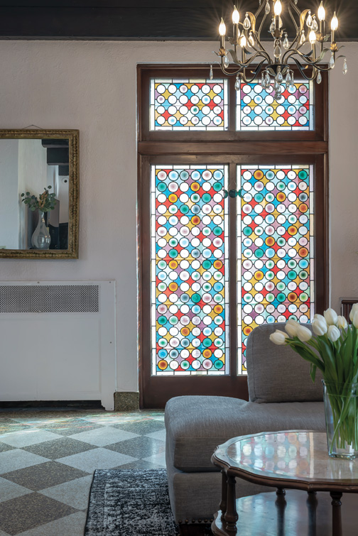 These exact colors hail from the main room’s mock terrazzo floor. Used by the family as a living room, the main room is sunken, allowing the lofty antique black and gold chandeliers above to cast a kaleidoscope of shimmering speckles. The pigments underscore the vividly hued stained-glass window nearby. Thus, pops of color wind their way inside the house from the oversized rug in the living room to the peppering of gold hardware in the kitchen. “One of the first things I did was wallpaper the powder room off the foyer. And I did it in bold black and gold using a large waterfall deco wallpaper,” Christa says.