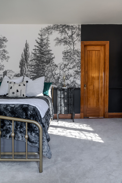 To balance the newly renovated kitchen with the rest of the home, Christa wanted to repeat some of its key elements. In the master bedroom, for example, she ensured that the accent wall behind the bed reflected the kitchen’s whites, rich browns and blacks by way of the wallpaper from Graham and Brown customized to offer a textured, fabric feel. The bedroom also has pops of wood in her choice of furniture and bamboo drapes. “I wanted to walk in the home and see a play of colors in the house with lots of blacks, clays, creams and nudes,” says Christa.