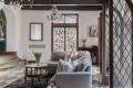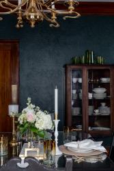 Another example of standout color occurs in the little inlays of gold acanthus leaf in some of the kitchen’s wall fixtures. “These symbolize enduring life in ancient Greece,” Ginger explains. “Isn’t that great for a kitchen you want to endure?” Without a doubt, Christa wanted her home to look gorgeous well into the future. “We wanted something that wouldn’t just be timeless because it reflects the past,” she says. “We want people in the future to still think our home is gorgeous.” The attention to age-specific details makes the home transcend any modern touches. “The lighting specifically was something that I was super diligent about,” Christa says. For her, the magnificent light fixtures ultimately transformed the house into a richly adorned period home.