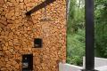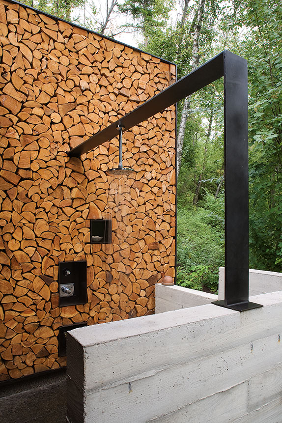 By Andersson-Wise Architects. This outdoor shower is designed to take in views of the native pine forest and Flathead lake beyond. The north wall of the shower is made of Grand Fir cordwood that was harvested from the site. Low cast-in-place concrete walls form an outdoor, lakeside privacy screen that preserves the view to the lake while defining an edge to the shower space.