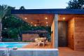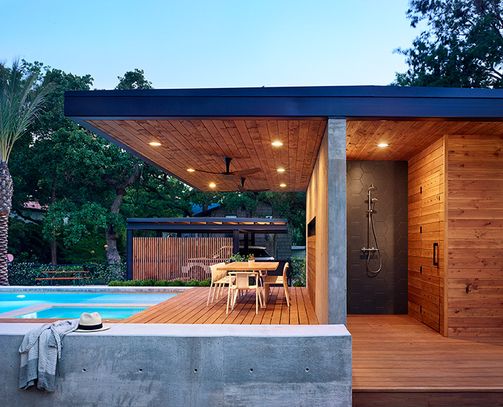 By Matt Garcia Design. The designer wanted the outdoor shower to be private yet easily connected to the poolscape. The pool house is framed by two exposed concrete walls. The shower had to be warm and full of texture. The designer incorporated the concrete wall along with adding a dark hexagon tile as the main shower wall. The color plays off of the dark steel fascia. Opposite the concrete wall is a cedar wood siding that features a hidden door into the sink and toilet room. The decking material is ipe and the soffit above is cedar as well. Towel hooks on the concrete wall and a small teak bench complete the space.