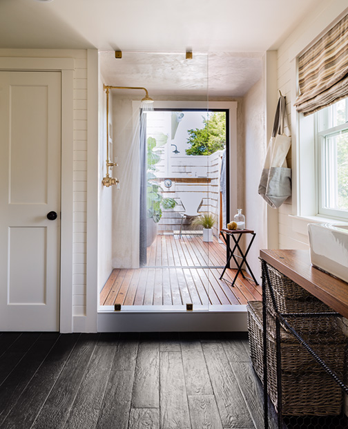 By Dewson Construction Company. The best of both worlds—a spacious tiled indoor shower with double doors that lead to and an outdoor shower surrounded by IPE wall panels and IPE decking. The double doors are glass with metal frames that allow for a seamless transition from the indoor space to the outdoor space. The wall panels offer the warm and cozy feeling of wood and provide privacy while natural light flows in from above the walls and through the pergola style structure above.