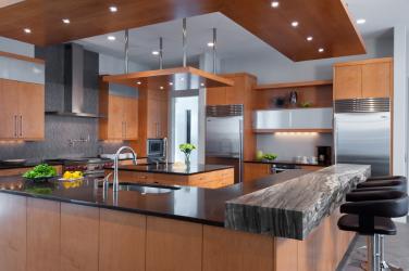 Designed to accommodate a multi-generational family, this modern, sleek kitchen is both clean and functional. Two large islands, a light rail above the island counters and a breakfast and snack wall add unique elements to the space designed by Krista Howard, Krista Howard Interiors. A square-shaped island was included for main food preparation, while an “L” shaped area is for casual dining at the counter. The “L” shaped counter is topped with beautiful waterfall granite that wraps along the vertical side of the cabinet. Contemporary wood cabinetry extends to 9’ 6” and warms the space. Along the cabinets in front of the bar stools is additional hidden storage, which has been quite an asset to the space. The drop-down light rail is suspended by sleek steel posts and mirrors the wood finish of the cabinets. The rail is a fabulous alternative to task lighting. Located along the right wall, a breakfast and snack area houses an additional microwave and drawers that store bowls for kid-friendly access.