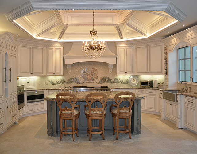 This was in an interesting kitchen where the ceiling design idea came from an old image that the homeowner had. The design and construction team did a lot of head scratching to give the client the exact design that she had in mind. It was quite a challenge putting together all of the cabinetry and matching molding pieces on several plains.