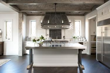 The ceiling in The Cliffs Lake Keowee residence features reclaimed beams. Arches between the beams are dressed with brick. A custom-designed and hand-crafted iron chandelier hangs over the island.