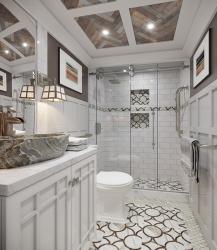 The designer added light gray wainscoting with dark brown, low VOC wall paint above to add contrast to the newly added custom wainscoting in this minuscule bathroom. LED recessed ceiling lights were integrated to reduce power consumption. Overall, this bathroom achieved the goal of being environmentally friendly as well as design conscious.