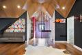 This ceiling is in a converted attic in Brooklyn. The roof was a series of peaks and rafters. The designer clad the entire shape with finish grade plywood, added lights and then painted the walls black with blackbird paint.