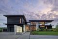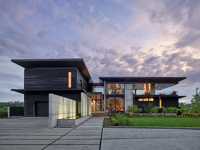 4. By Hays + Ewing Design Studio. This Virginia Beach modern home has a striking presence as seen from the water. A linear fountain strikes a line along the entry path, disappears below the house then reappears as a pool and foreground to Linkhorn Bay. A trellis further strengthens the connection between the water elements and the shoreline; it travels along the entry walkway, through a vestibule to hover above the pool. Exterior materials include concrete, glass, stained wood and composite metal panels.