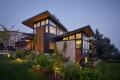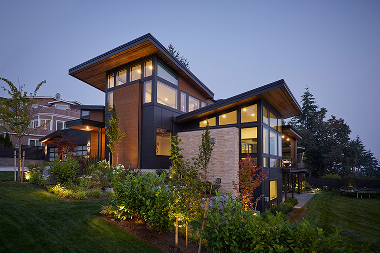 The "Nordic Modern" exterior is composed of clear cedar vertical siding, black-painted Hardie lap siding and corrugated steel siding. Strategic window placement captures light and frames views while providing privacy from the next door neighbors. Four operable skylights bring daylight and ventilation deep into the house.