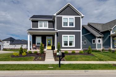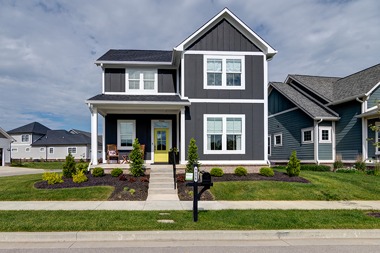 Combining bold exterior paints and a traditional elevation, this modern farmhouse is a homeowner design. Interior design partner Everything Home wanted to make an additional impact with a statement front door, choosing Sherwin-Williams Frolic to complete the look.
