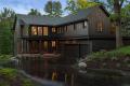The exterior is a transitional contemporary farmhouse with dark gray metal siding and rustic burnt orange accent trim. The exterior blends seamlessly with nature and features expansive views of the lake and wooded property.
