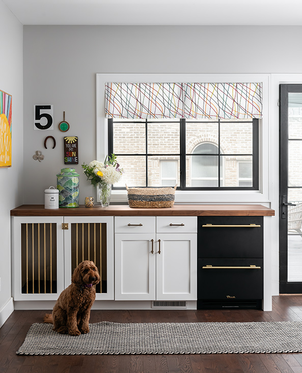 With functionality requirements established, the form and personality came to life in many exciting ways. A new built-in dry bar featuring St. Louis-based True Refrigeration with matte black and gold accent drawer coolers brings stylish contrast to the locally made butcher block countertops, and a custom built-in doggie crate provides a conversation piece for the owners and a private den for the doodle.