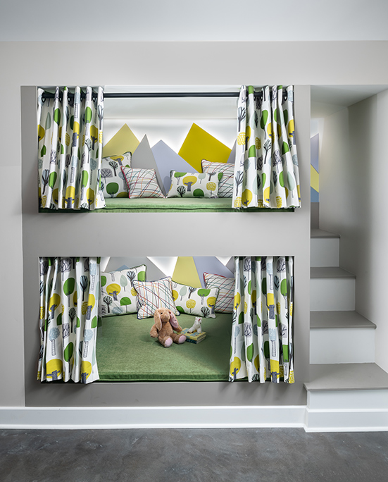 The unfinished basement involved a complete transformation that now includes a reading nook under the stairs with full-size bunk beds that are backlit and have hidden bookcases tucked inside. “It’s a pretty magical place to hang out and the first thing you see as you come down the staircase,” says Sara. Mirroring the initiation to the home’s main level, the entrance into the basement family room welcomes the children and their friends and establishes a space that can work for both adult and teen entertaining. Warm, gray-stained concrete throughout creates a modern feel that is brightened by a multi-colored rug to cozy up the main seating area. A large-scale contemporary chandelier makes a statement above the seating area, and matching wooden grid walls were added behind the TV area and at the side of the bar to add dimension to the massive space.