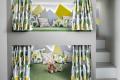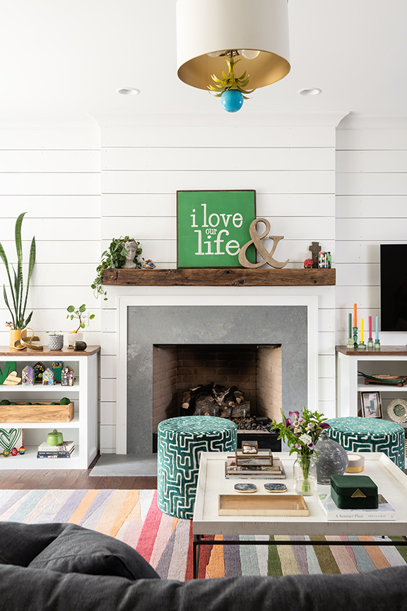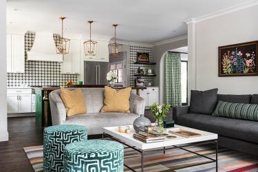 Building off this focal point, Sara’s space-planning strategy included a cozy conversation area with custom Chaddock loveseats upholstered in a chunky bouclé Pindler fabric accented with bright yellow Thibaut pillows. A whimsical pair of emerald geometric Fabricut ottomans at the fireplace complements the palette. “I love pattern and color,” says Emily. “I wanted a home with purposeful spaces that reflected who we are as a family—comfortable, fun, and welcoming. The rug in the living room was super fun to create in partnership with Sara.”