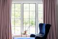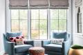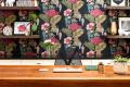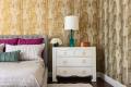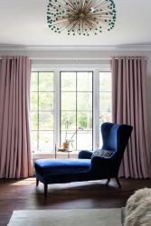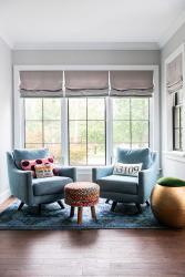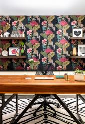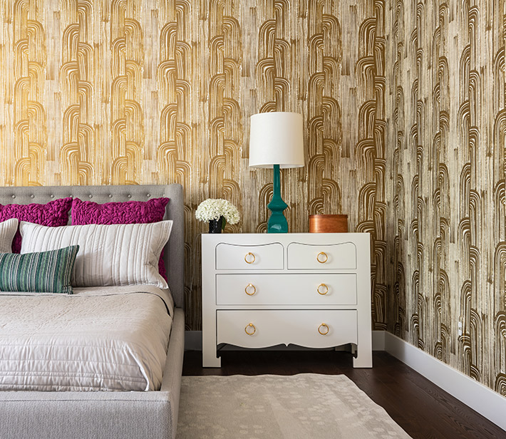 “Perhaps one of my favorite rooms in the entire house is Emily’s new workspace,” says Sara. “It brings a new spin on the adage that all work and no playful design makes for a boring home office. Harlequin wallpaper and a Nikki Chu area rug are gorgeous and powerfully feminine. Modern business demands a striking background for Zoom meetings—and this wallpaper delivers and establishes a clear visual tone.” Colors from the wallpaper are echoed in the bookcase, custom chair and ottoman, and sheer draperies with polka dots invite plenty of natural light without sacrificing style.