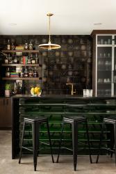 The couple’s posh, hip personal style and love of color are reflected throughout the design. The designer and homeowners share an appreciation for bold prints and high-contrast colors—especially green—which led to a truly collaborative design process. “I love color, and working with Sara was so fun,” says Emily. “She got my passion for color and was able to integrate it into our home in an intentional way—playful and refined all at the same time.”