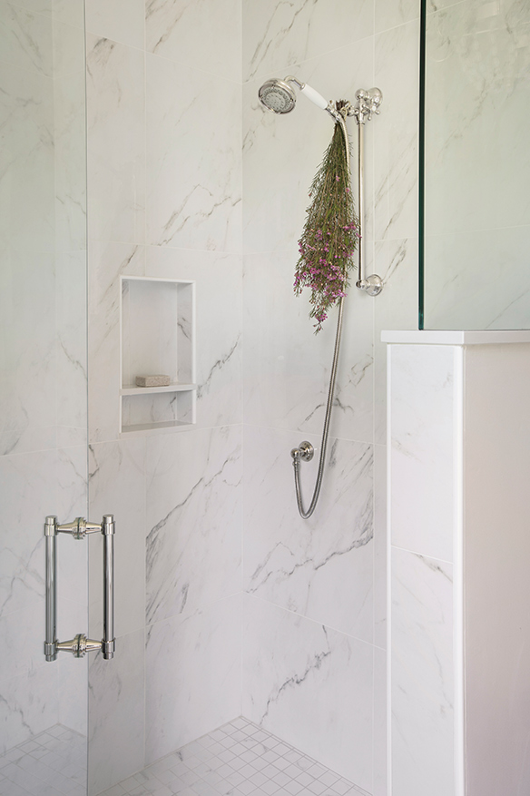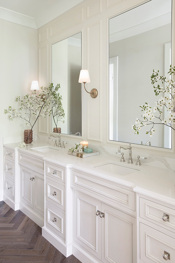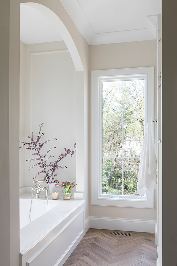 The homeowner desired lots of natural light in a timeless design. Accent on Cabinets and Jeffrey Homes took on the challenge to make sure all the elements of a luxury bath were part of the design while keeping the size modest. A galley bath layout was chosen to give the homeowners their wish to have a large shower and a soaking tub separate from the vanity. Using the same wood floor in the bathroom but setting it in a herringbone fashion adds a classic and elegant detail. The wood floor is also water resistant making it a unique choice for the bathroom.
