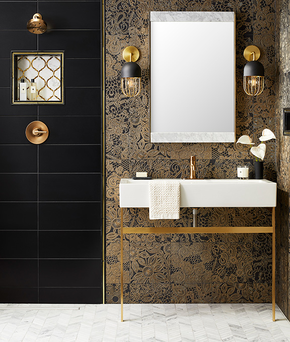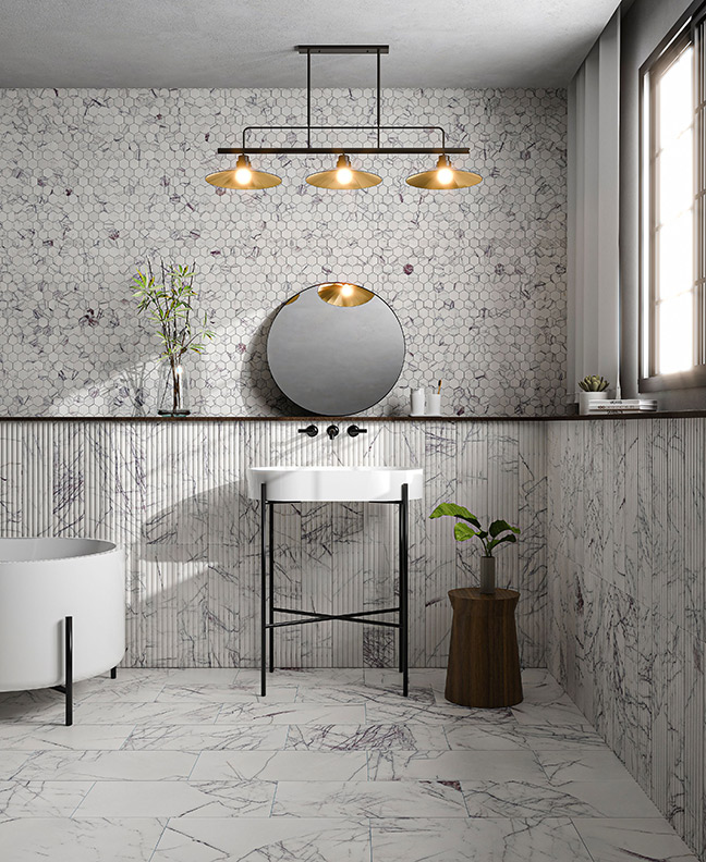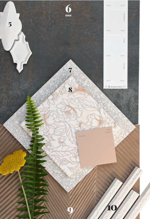 five: Marazzi, serliana in off white, by Virginia Tile. six: Crossville altered state in acid wash, by Virginia Tile. seven: Marazzi terrazzo in white, by Virginia Tile. eight: Melrose in gold dust and luster limestone, by Stone Impressions. nine: Ravine in dark brown, by Virginia Tile. ten: Inax, hosowari in white, by Virginia Tile, available at Henry Kitchen & Bath.