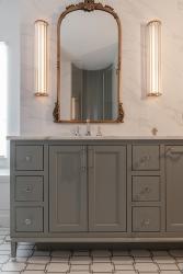 The narrow lot necessitated the placement of the primary bedroom on the second floor. “Putting the primary upstairs and installing an elevator gave us the entire first floor for living space,” Theresa mentions. Instead of building out a third bedroom on the second floor, the couple opted to turn the space into a library/television area for just the two of them. This room also features a mini kitchen, with a coffee station, microwave, refrigerator and freezer drawers, so that if either of them is ill, they can function entirely on the second floor. “This was all part of our thought of aging in place,” she notes. In addition, the home is equipped with the latest technology including energy efficiency, audiovisual security and surveillance.