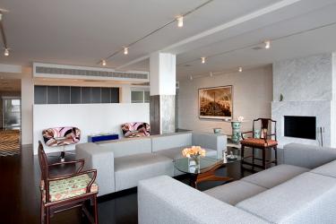 The track and fixtures are by Lightolier. This loft was designed with many of the same minimalist architectural details as a museum. Similar materials and lighting were used that would be in an art gallery.