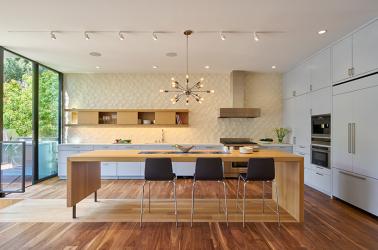 The design team utilized track lighting due to its flexibility of uses, bulb direction, spot ability and general grooviness. Other lights (pendants) were highlighted to add flair and function to the dining and entry features.