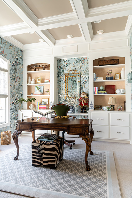 The Lovetts’ pops of surprising Yuletide colors essentially took last year’s Cardinal Glennon ‘Deck the Halls’ tour to a new level. “For something different, we wanted to get away from just a red and green scheme, and Dede helped tremendously in creating and executing a joyful, shiny vision. At times, it did feel like a mad-dash scramble, but we were still grateful for where we ended up,” Kathleen says. “I think we arrived at an elegant look that was out of the box, but was still like a new interpretation of a classic Christmas story,” Dede suggests, indicating she drew some color inspiration from timeless blue and green wallpaper already in the home.