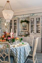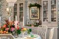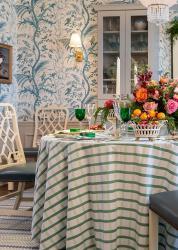 Atop the Lovetts’ dining table, plates with gold stars, golden flatware, a white bowl of pink-wrapped candies to match the floral arrangement and jewel-green boxes of decadent chocolates greeted diners, completing a room of hospitality.