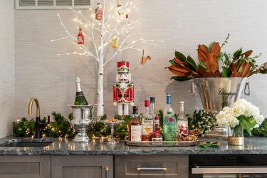 During the house’s renovation, she says they closed off their hearth room, making it a cozy bar area. There, for last year’s holiday decorating, they applied red and green accents and napkins, garland with lights, and a white birch tree decorated with liquor-inspired ornaments, all overseen by a special Nutcracker associated with Brian’s mother. “I love that time of year because it’s family-oriented and brings out the best in people,” says the certified relocation specialist willing to take a few bold risks for what’s often considered a vintage-rich holiday.