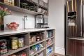 The pantry was for a private client who had an extensive wish list with limited space. They also didn’t want it to feel too closed in, so the designer went with mostly open shelving. In order to keep every inch easily accessible, the designer replaced two double doors that were in the original plan with a custom barn door on the outside wall.