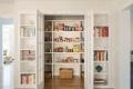 Open bookshelves and frosted french doors provide character and function in an otherwise drab corner of an open breakfast/kitchen area. The doors conceal a hard-working pantry at times organized or overflowing.